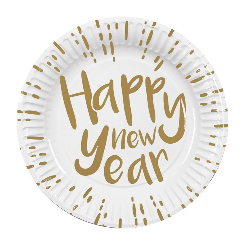 Ces jolies assiettes en carton blanc biodégradables de 23 cm sont imprimées en or happy new year .
