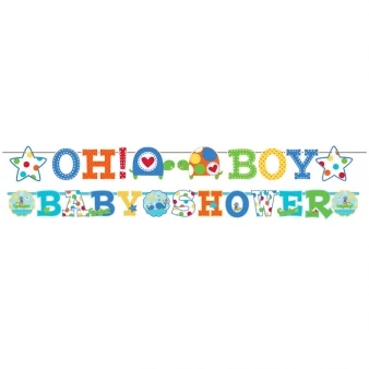 Kit baby shower comprenant : 1 Guirlande en carton avec lettres géantes imprimées sur une face de 3 mètres de long sur 26 cm de haut environ 1 guirlande de 1 mètre 80 sur 13 cm Une décoration originale et colorée pour vos fêtes baby shower