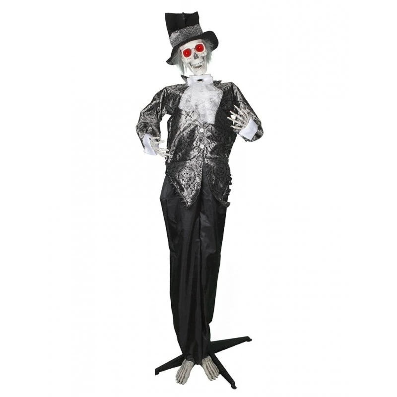 Un squelette grandeur nature , habillé d’une redingote en satin gris broché avec jabot en dentelle blanche , est monté sur un socle et est animé grâce à 3 piles AA non fournies de cris avec yeux clignotants .