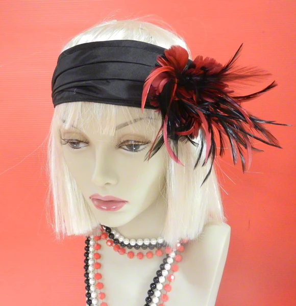 Très joli bandeau année folle en tissu rehaussé d’une fleur en plumes rouges et noires Une façon originale d’accessoiriser déguisement et robe charleston lors de soirées sur le thème cinéma , Gatsby , Al Capone , années folles … Taille unique Convient à toutes les têtes