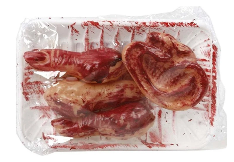 Cette barquette filmée en plastique contient 3 doigst coupés de 9 cm et une oreille comme au supermarché..