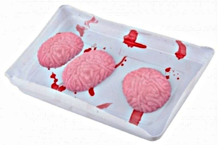 Lo t de 3 mini cerveaux ( environ 6 cm ) prĂ©sentĂ©s en barquette . en matiĂšre gĂ©latineuse pour personnaliser buffets et tables d’halloween