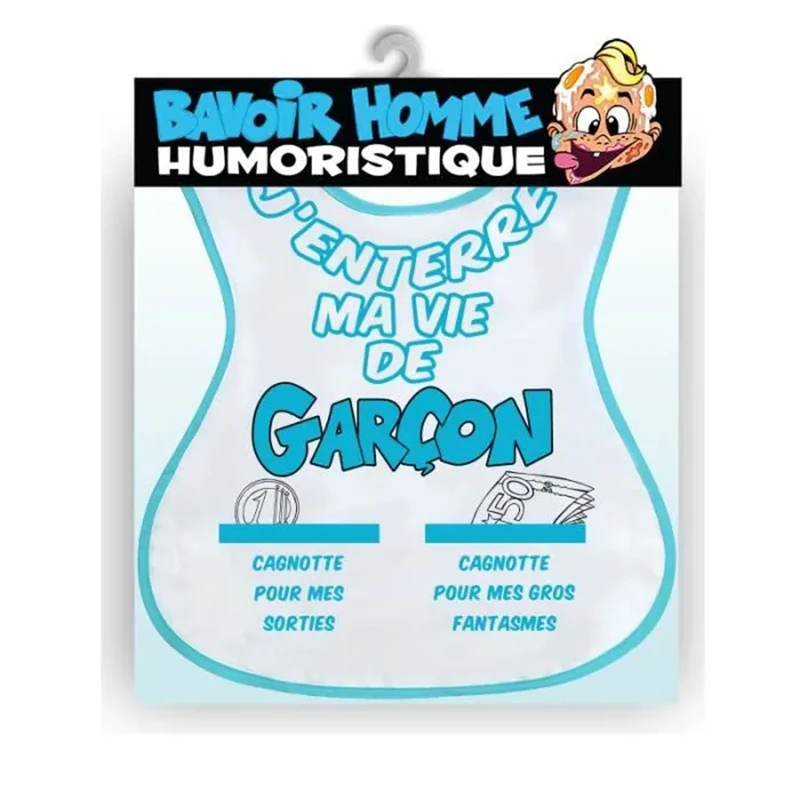 Bavoir en tissu blanc imprimé » j’enterre ma vie de garçon » en bleu turquoise .