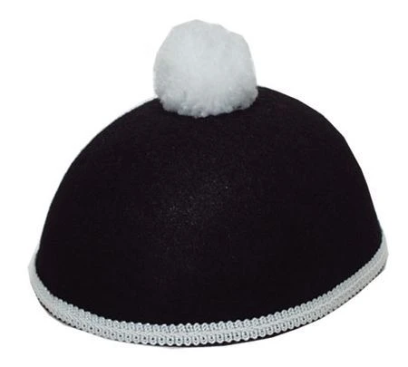 Calot de pierrot noir en feutrine orné de galons blancs et pompon . Accessoire indispensable pour vos déguisement de pierrot ,colombine ou déguisement sur le thème du cirque