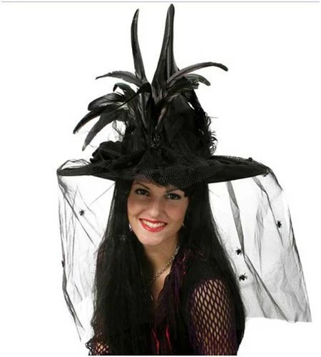 Superbe chapeau de sorcière adulte en taffetas et résille agrémenté de vraies plumes Chapeau original pour accessoiriser et compléter avantageusement un déguisement de sorcière à l’occasion de fêtes à thèmes et déguisées (halloween, épouvante…), de spectacles ou encore de carnaval.