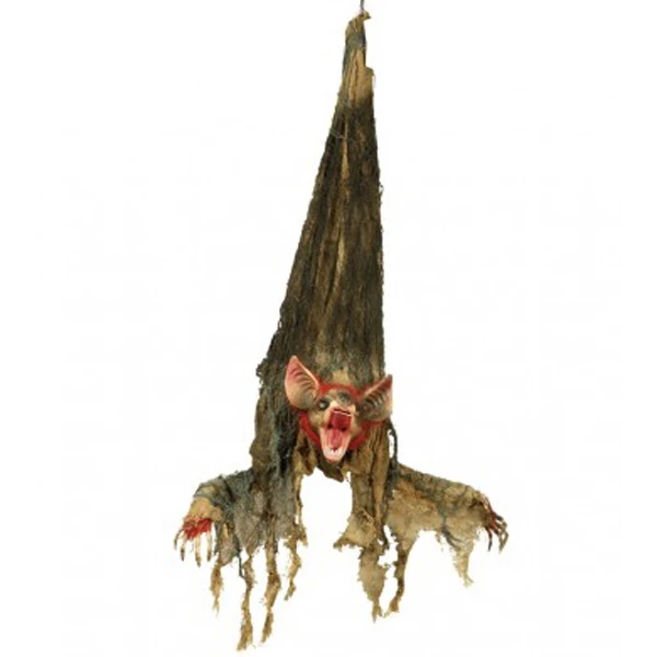 Chauve souris de 110 cm de long en tissu et plastique , animée dont le son et le mouvement se déclenche au bruit ou grâce à un capteur de mouvements .