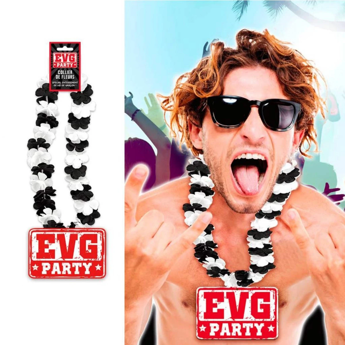 Ce collier en fleurs noires et blanches de 100 cm est ornĂ© d’une plaque en carton brillant ( 16 cm x 10 cm ) imprimĂ© du logo EVG party façon vintage .