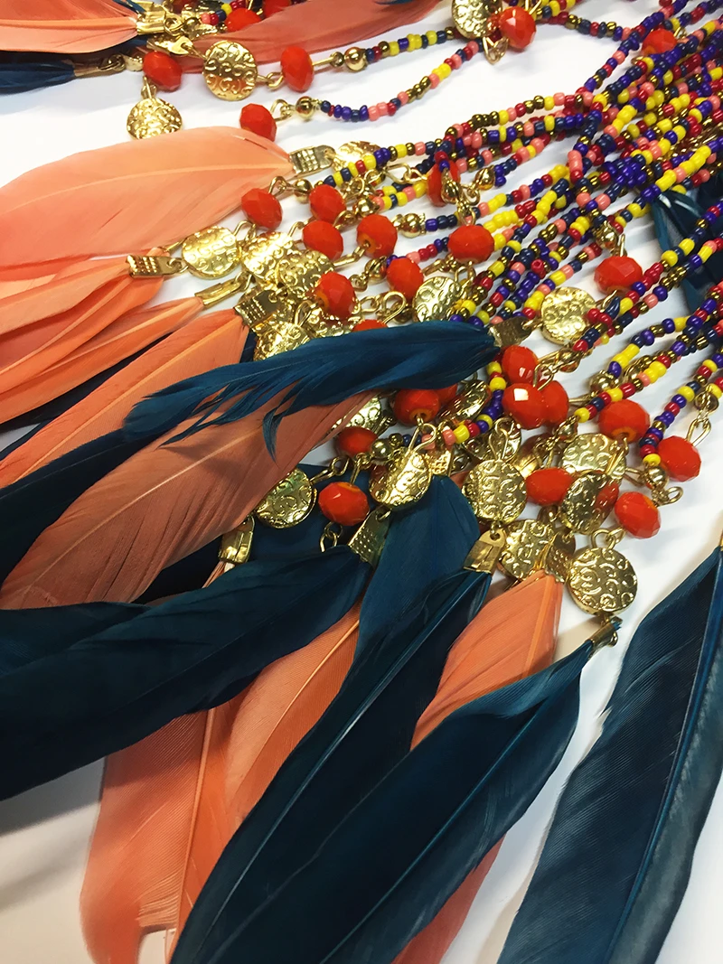 Magnifique collier indien composé d’un tour de cou en métal doré et pierres bleus duquel partent des fils de petites perles multicolores terminés par de véritables plumes.