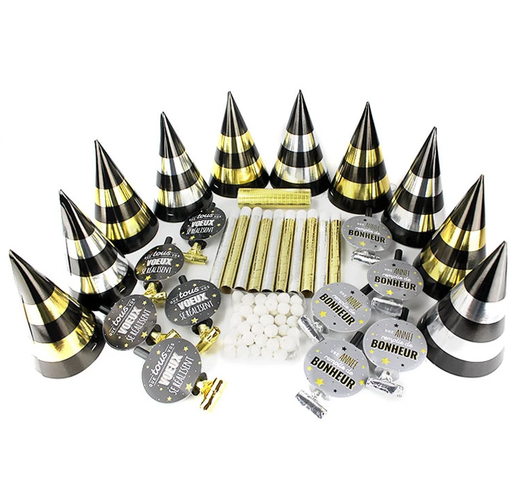 du produit « Cotillons 10 personnes or , argent ,noir »