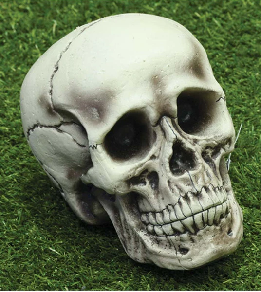 Tête de mort en polystyrène très réaliste de 22 cm X 17 cm environ . Une accessoire de décoration à utiliser comme centre de table , en décoration de salle . Peux servir également pour la fabrication au gré de votre imagination , de suspensions , de canne ou une foule de décors pour le thème pirate et halloween .