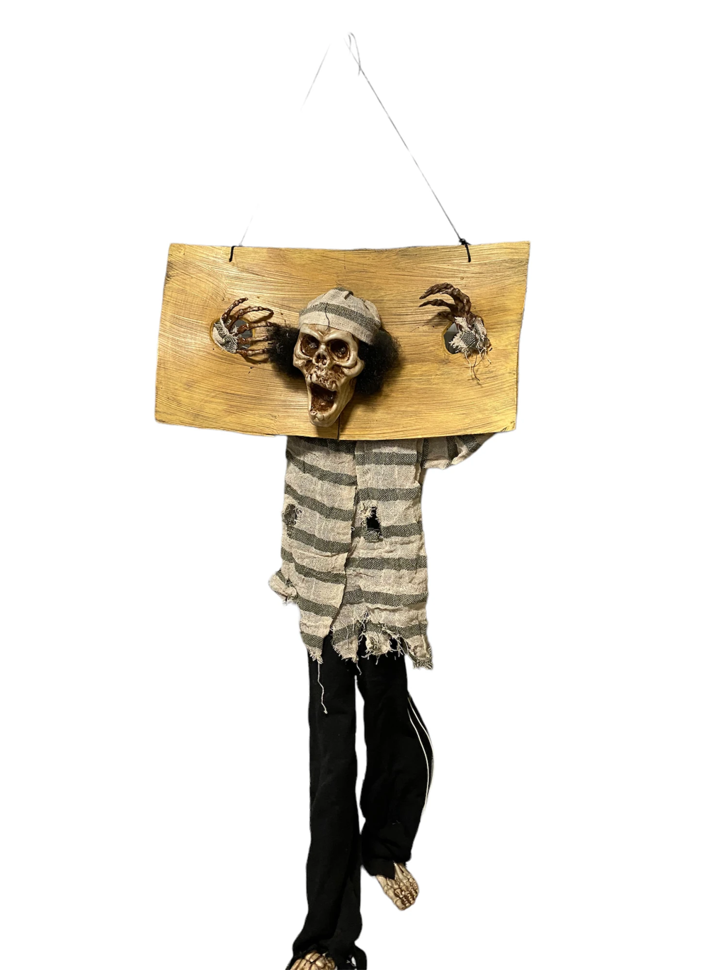 décor halloween à suspendre représentant un prisonnier dans un carcan .