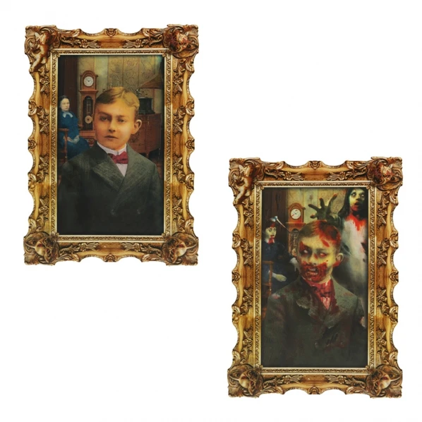 Décor en plastique sur le thème d’halloween façon hologramme à suspendre Une décoration représentant un portrait d’homme en 3 d dans un cadre ancien baroque qui se transforme en zombie en fonction de l’angle de vue . Dimension : 42 cm X 30 cm Une façon originale de personnaliser vos décors pour halloween .. ambiance garantie