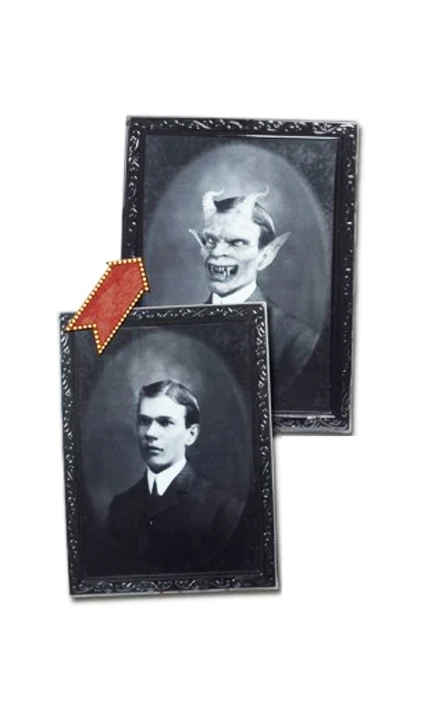 Cadre en plastique sur le thème d’halloween en noir et blanc façon hologramme à suspendre Une décoration représentant un portrait d’homme en 3 d dans un cadre ancien baroque qui se transforme en démon en fonction de l’angle de vue . Dimension : 49 cm X 36 cm Une façon originale de personnaliser vos décors pour halloween .. ambiance garantie