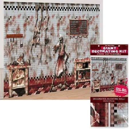 1 Pack de 2 Rouleaux de Décorations murales « boucherie gore ». Décorations en plastique représentant une boucherie : une salle lugubre aux allures d’abattoir. Un rouleau pour le haut des murs de la pièce et un rouleau pour le bas . Chaque rouleau à une hauteur de 1,2 m et de 7 m de long. A l’instar de posters ils sont à apposer sur les murs d’une chambre, d’une salle de spectacle ou de fête à l’aide de punaises, de ruban adhésif double face ou de pâte à fixe (non fournis et vendus séparément sur ce site). Idéal pour créer un mur d’ambiance (scène setters) sur lequel pourront s’ajouter d’autres additifs de décorations murales sur le même thème d’halloween et de l’horreur, vendus séparément sur ce site . Une façon originale et spectaculaire de recréer l’ambiance des film gore et d’épouvante. Ce Pack permet de transformer en un clin d’oeil un espace. Pour couvrir complètement une pièce il suffit d’acheter plusieurs rouleaux et de les apposer les uns à côté des autres, à la fois dans le sens de la hauteur et de la largeur. Ces rouleaux plastique peuvent également être découpés pour s’adapter parfaitement à la dimension de la surface à décorer. Il est recommandé d’utiliser ce pack en complément des décorations murales vendues également sur ce site. Effet spectaculaire garanti ! Bluffant ! Idéal pour Halloween Composé de 6 pièces à assembler Deux panneaux de 1m22 sur 3.66 chacunQuatre panneaux de 85 cm sur 1m65 chacunCes panneaux sont en matière plastique, ils sont réutilisables et peuvent être utilisés en extérieur ou intérieur.Se fixent sur une surface plane a l’aide d’adhésif double face, d’agrafes ou de pâte adhésive type Patafix