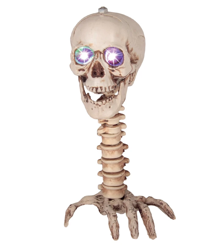 Décor halloween en plastique de 25 cm de haut représentant un crâne avec une partie de la colonne vertébrale posé sur une main Un système de leds dans les orbites permettent un changement en boucle de couleurs Idéal pour vos centres de tables ou buffet pour halloween