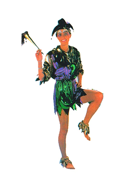 Déguisement de lutin ou fou du roi femme comprenant une robe tunique en tissu métallisé violet , vert et or avec élastique à la taille , un chapeau coordonné à trois pans garni de grelots , une paire de sur chaussures métallisées . Un déguisement idéal pour les saltimbanques des fêtes médiévales , pour incarner elfes ou lutins . Peut être porté en robe ou tunique Autres accessoires non fournis