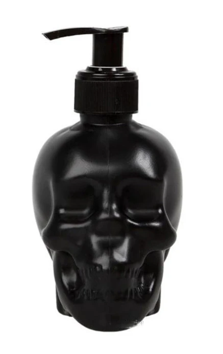 Distributeur de savon ou gel en plastique en forme de crâne noir de 11 cm x 15 cm .