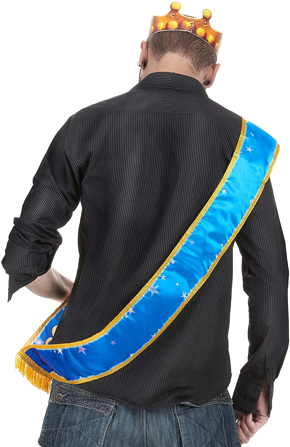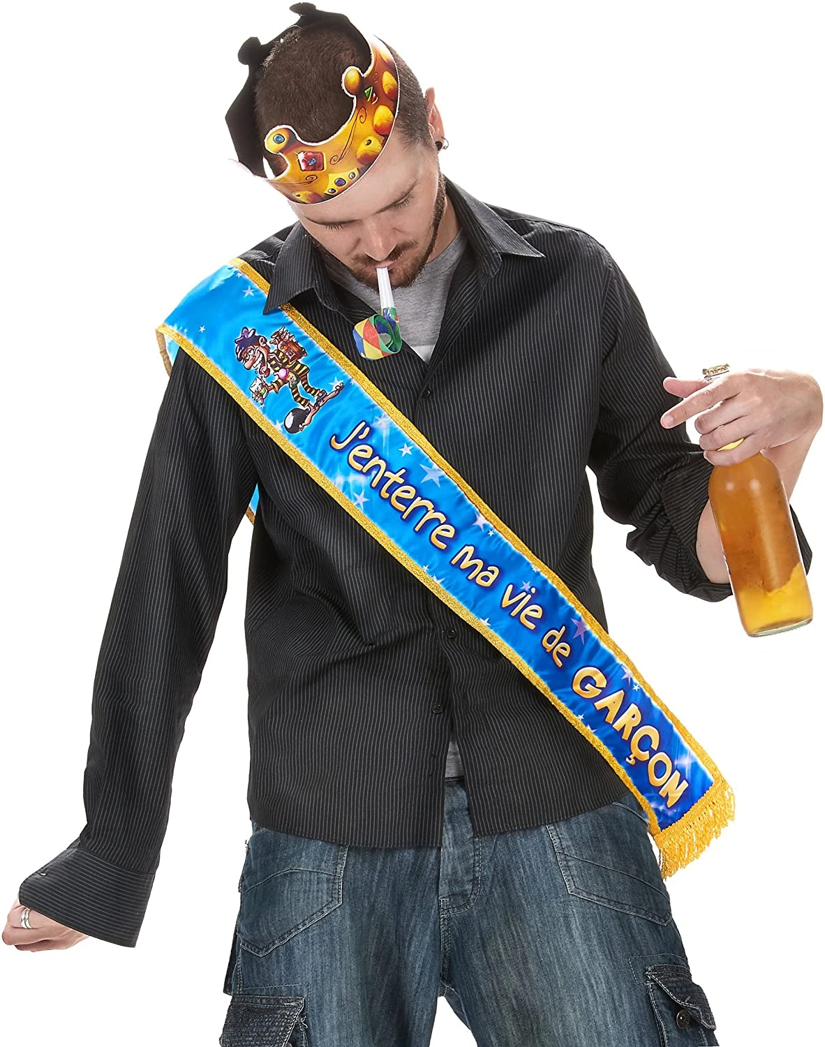 Lors d’un enterrement de vie de garçon, cette écharpe sera idéale pour faire du futur marié le Mister de la journée. Satinée bleue et imprimée de motifs aux bordures dorées, ecriture dorée , franges dorées , une fois placée sur le torse de l’heureux élu, elle fera à coup sûr son effet !