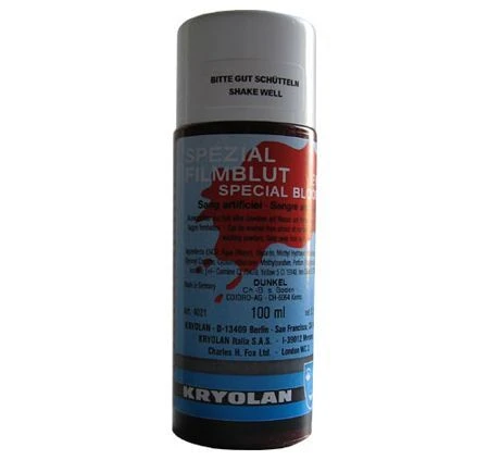 Sang spécial Film Universel (Intern/Extern/Lavalble) Clair/Foncé. 100 ml. Sang aux pigments réalistes pour cinéma et télévision, formule qui permet l’usage dans la bouche et le nez, de même que sur la peau. Test recommandé au préalable.