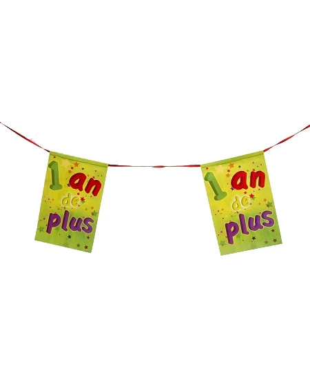 Guirlande anniversaire » 1 an de plus » de 4 mètres de long avec 8 pavillons de 28cm de haut tous les 20cm imprimés recto verso . Une décoration originale et chic pour vos anniversaires.