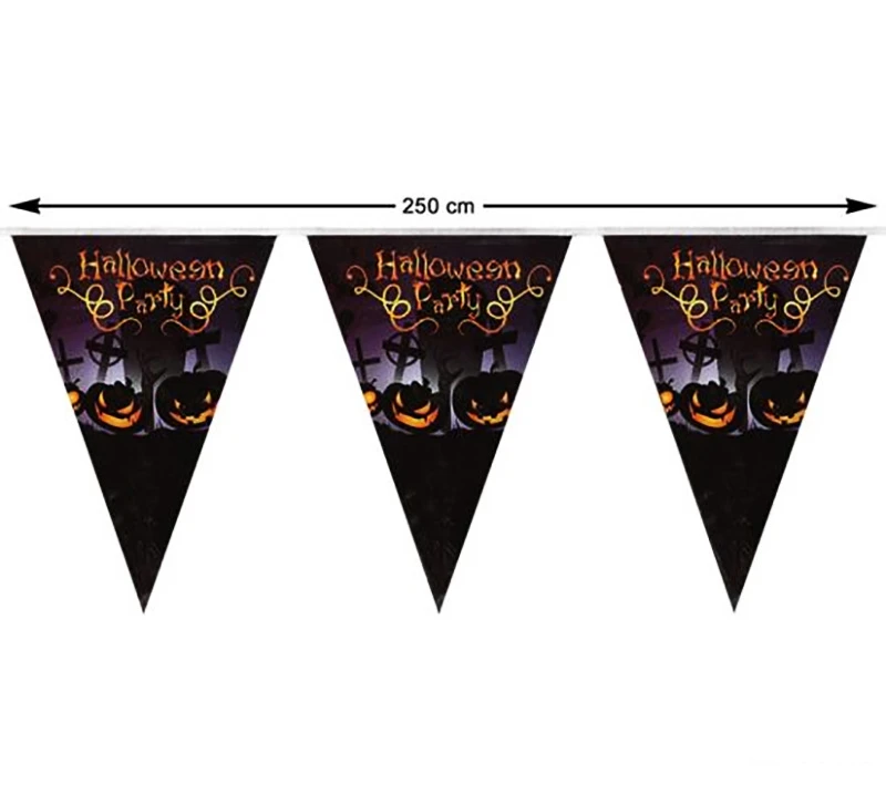 Cette guirlande fanions de 250 cm x 28 cm est composé de fanions imprimés sur les faces de motifs citrouilles , cimetière