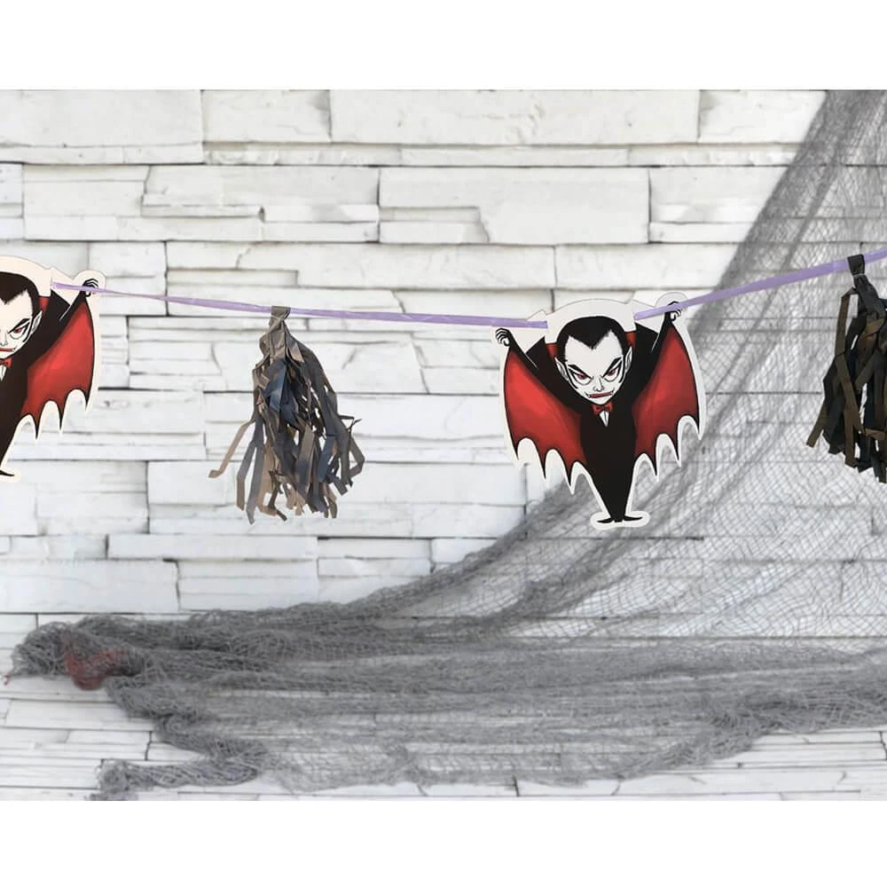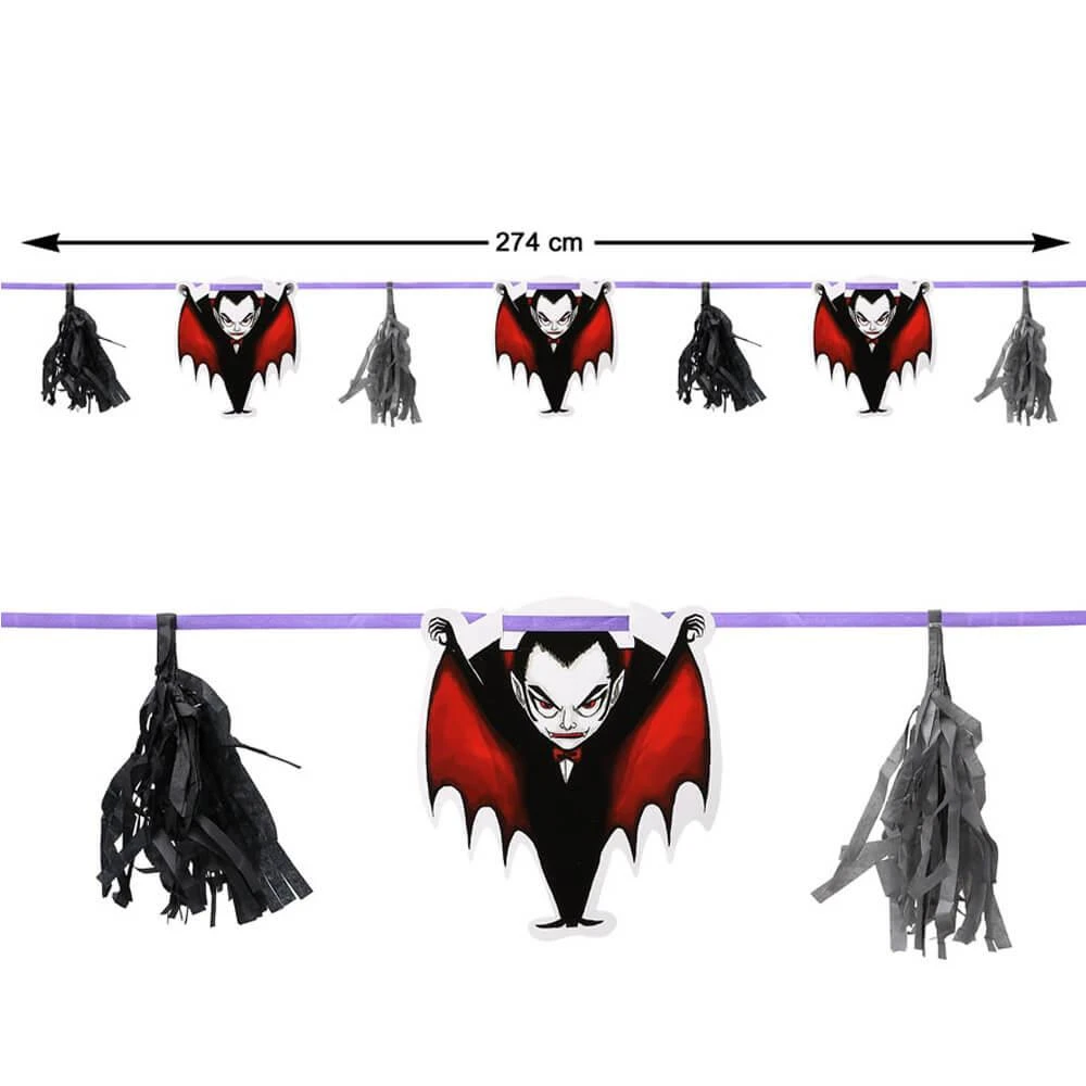 cette guirlande originale de 274 cm en papier , est constituée de decors de 23 cm x 20 imprimés sur les 2 faces et représentant un vampire et de pompons en papier .