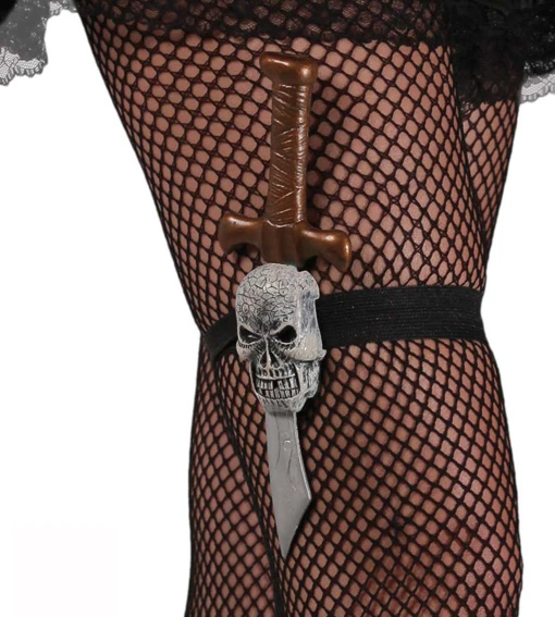 Jarretière avec tête de mort et poignard de 23 cm . Un accessoire original et sexy pour des tenues de diablesses , pirates , vampires