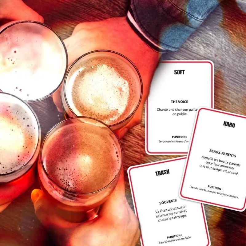 Jeu de 24 cartes reparties en 24 gages de 3 categories : soft , hard et trash .