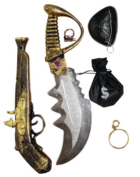 Kit de pirate comprenant : un pistolet un sabre un cache oeil une boucle d’oreille à clip une bague une bourse avec pièces Panoplie complète pour accessoiriser vos déguisements de pirates , corsaire