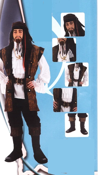 kit de pirate comprenant: une veste sans manche un bandana une ceinture un jabot une paire de surbottes en tissus Kit idéal pour un déguisement de pirate, marquis, mousquetaire taille unique jusqu’au XL autres accessoires non fournis