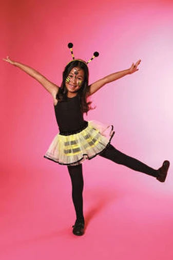 Kit de déguisement sur le thème abeille comprenant : une jupe tutu en satin et resille jaune et noir un serre tête avec des antennes hauteur de la jupe : 22 cmTaille unique 4/6 ans