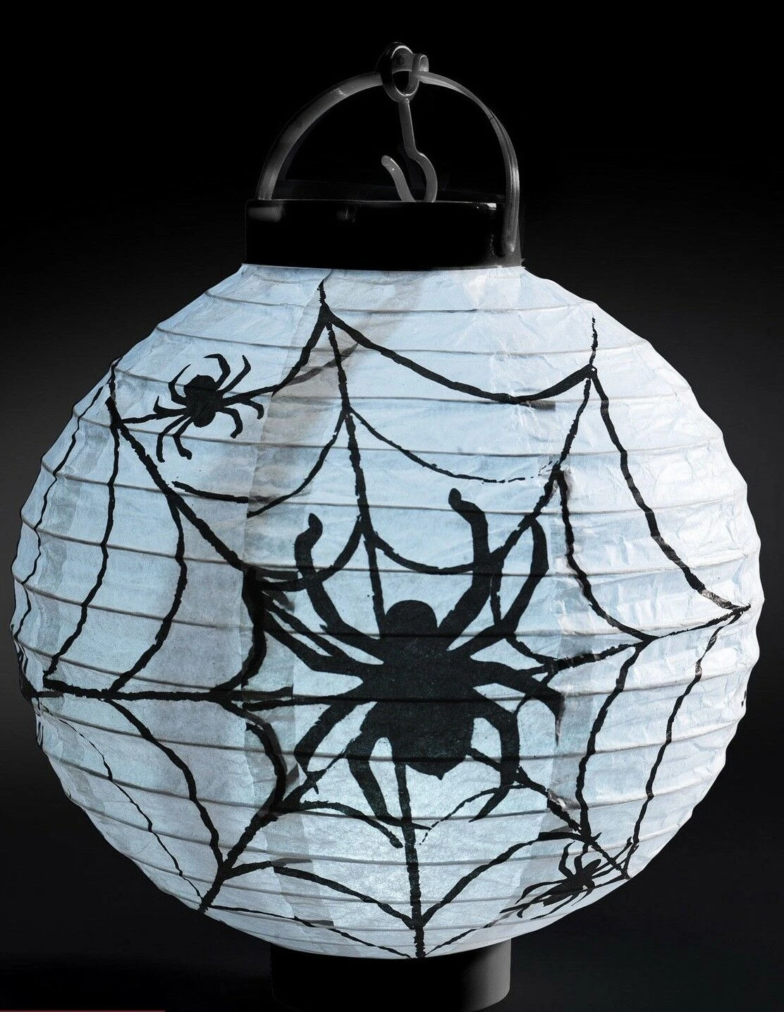 cette joli lanterne chinoise blanche à leds imprimée de toile d’araignée sera parfaite pour vos décorations d’halloween .