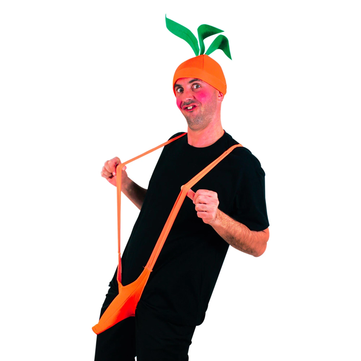 ce déguisement complètement loufoque est constitué d’un strind façon Borat orange , un capeau avec feuilles coordonné .