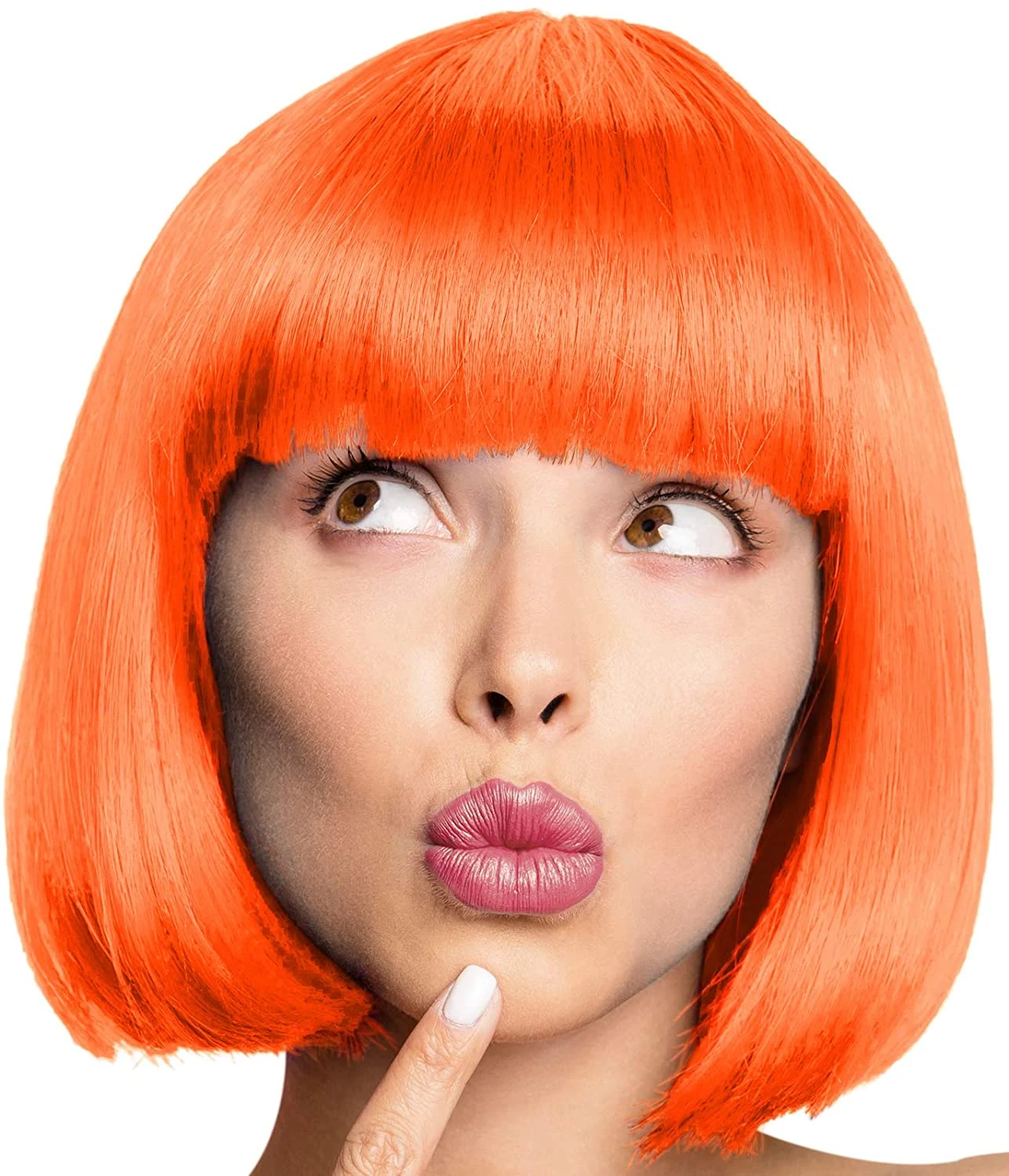 Une perruque au carré façon charleston orange de très belle qualité qui peut compléter un déguisement disco,cabaret, années 70 ou encore charleston et années folles, pour carnaval, et des soirées à thème ou fêtes déguisées réussies