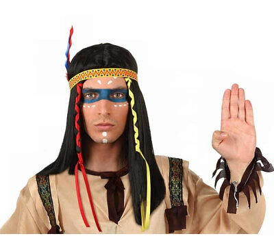 Perruque ornée de 2 nattes avec rubans et d’un bandeau avec plumes amovible .