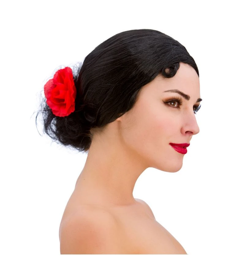 Perruque de sénorita espagnole avec chignon bas et fleur rouge en tissu .