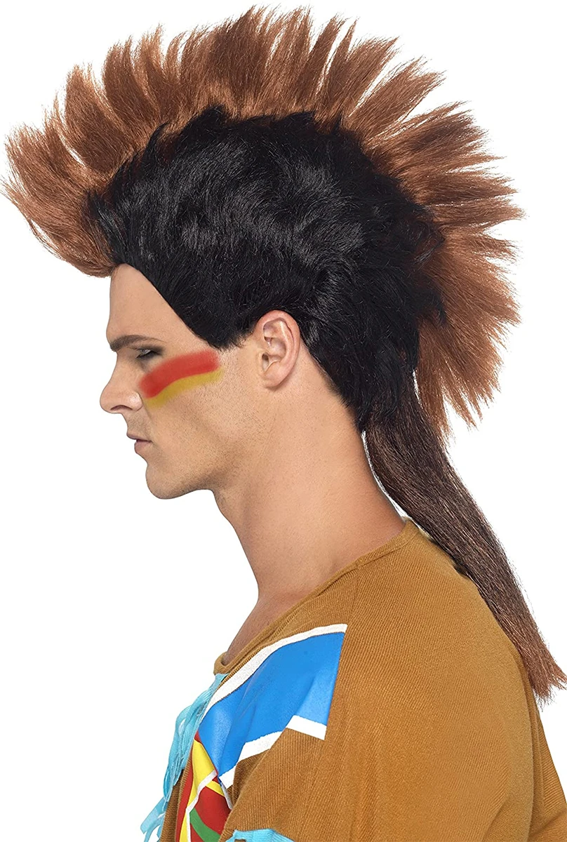 Perruque d’indien Mohican noire avec nuque longue et crête marron .