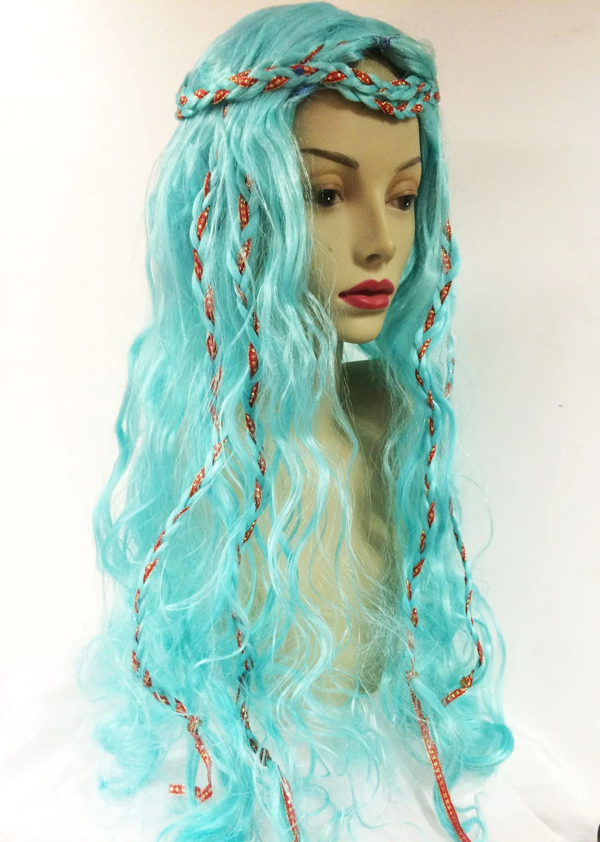 Perruque longue bleue avec tresses sur les cotés pour compléter idéalement toutes les tenues d’elfes hippie