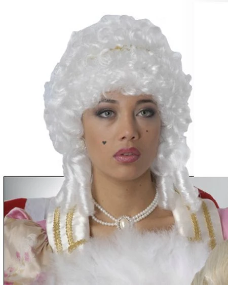 Perruque de marquise blanche relevée et montée en chignon avec deux anglaises de chaque coté et dans le dos . Perruque qualité supérieure, maintenue sur la tête grâce à un filet élastique qui s’enfile comme un bonnet : convient à toutes les têtes . Perruque synthétique Idéal pour les soirées à thème « marquis , marquise, Louis XV , pirate, noblesse, versaille ».