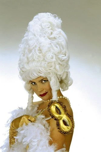 PERRUQUE BLANCHE roccoco Perruque baroque très stylée, tout en volume. Perruque de grande qualité, idéale pour compléter un déguisement de carnaval ou un costume d’époque (marquise, cantatrice, précieuse , carnaval de Venise..). Perruque parfaitement adaptée à des soirées costumées et déguisées à thèmes ou pour un spectacle.