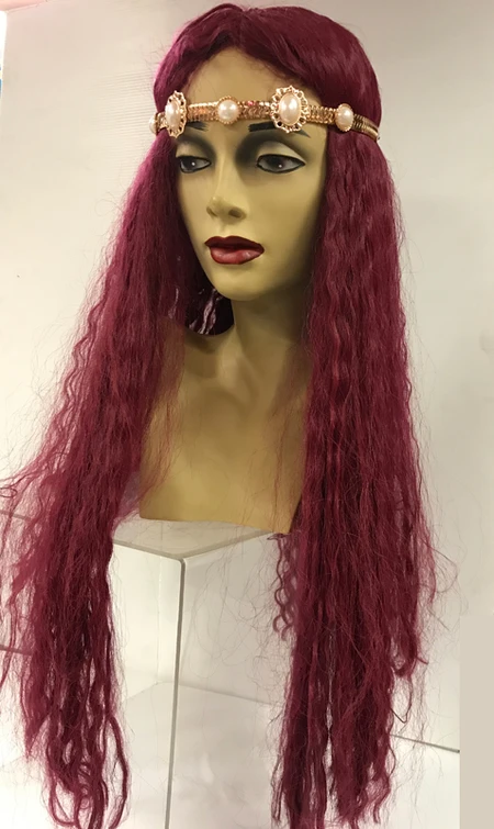 Perruque gaufrée auburn , avec son diadème parfaite pour une soirée médiévale ou elfique . Le diadème entoure la tête avec une élastique à l’arrière.