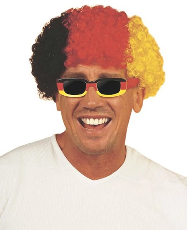 Perruque pop afro rouge, jaune noire aux couleurs de la belgique ou de l’allemagne
