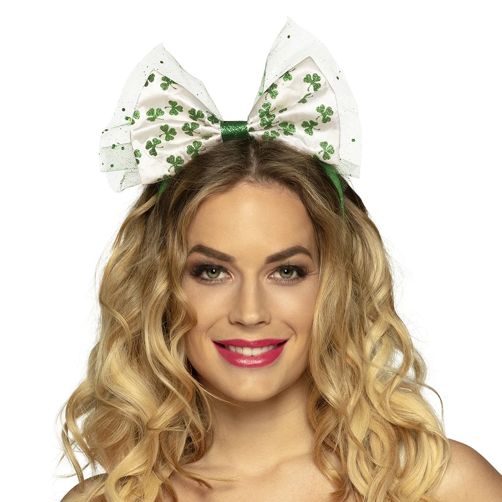 Serre tête vert orné d’un gros neoud en satin blanc imprimé de trèfles pailletés rehaussé de tulle vert pailleté