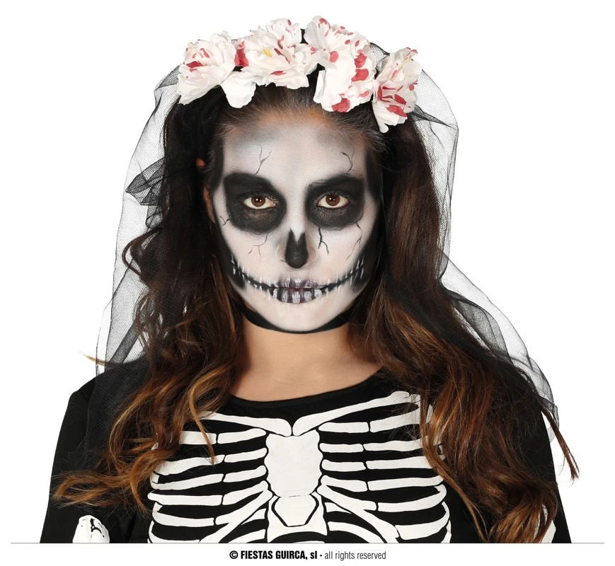 Le serre tête est orné de fleurs en tissu tachées de sang et d’un voile noir .
