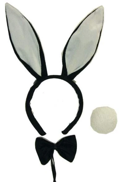 Set de lapin ou Bonny noir comprenant un serre tête avec oreilles noires et blanches , un nud papillon , une queue pompon Accessoires idéal pour enterrement de vie de célibataire , soirée Bonny