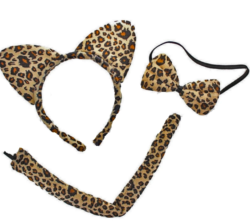 Set 3 pièces de panthère comprenant : un serre tête imprimé léopard avec des oreilles un nud papillon assorti une queue coordonnée de 30 cm de long