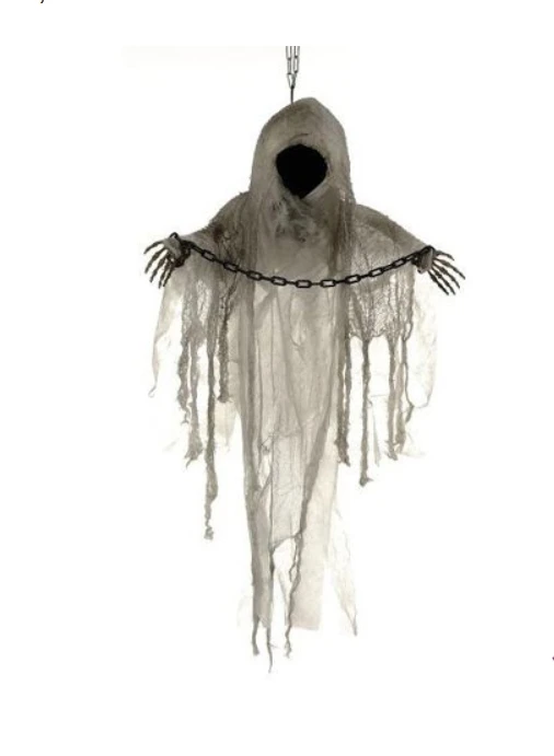Suspension animée thème halloween représentant la mort . La suspension est animée de mouvements, d’effets sonores et lumineux Suspension de 90 cm de haut en tissu et plastique Une façon originale de surprendre vos invités le soir d’ahlloween ou de soirées pirates