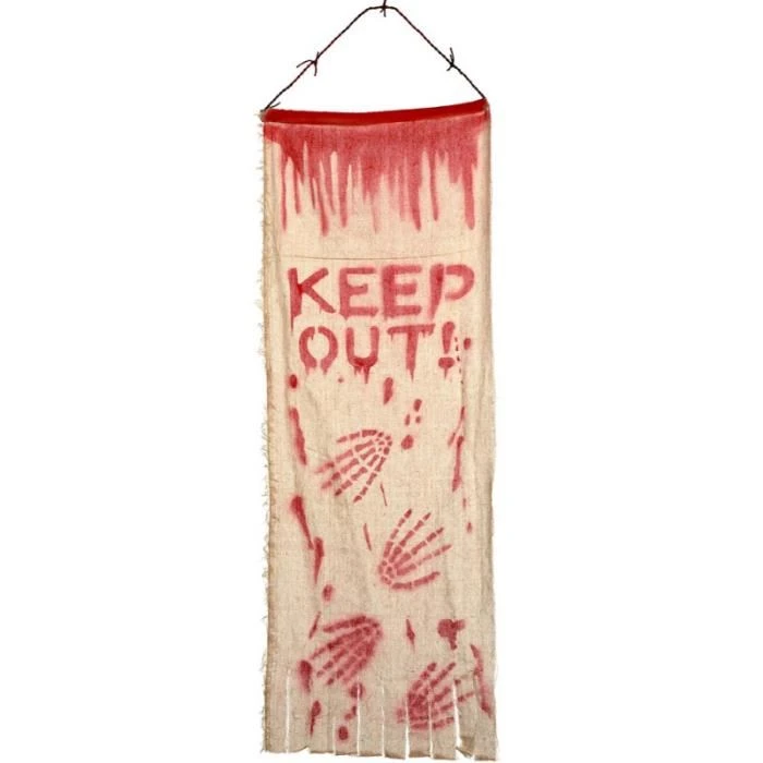 Idéal pour compléter votre décoration Halloween !Ce rideau en tissu blanc mesure 120 x 40 cm.Il est couvert de tâches de faux sang, et porte l’inscription « Keep out » en lettres ensanglantées.