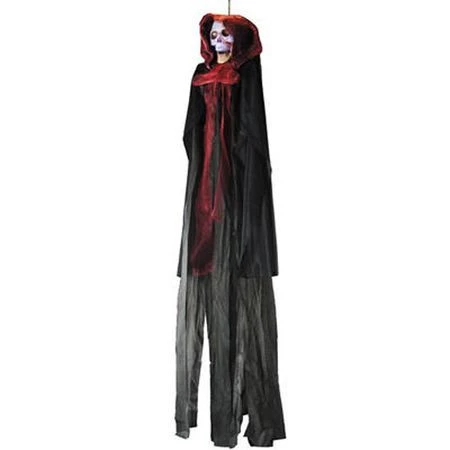 Suspension de squelette en plastique et tissu de 120 cm de haut avec système lumineux ( la tête s’éclaire , piles fournies ) Le squelette est habillé d’une grande cape à capuche rouge et noire . une façon originale de créer une ambiance d’horreur à donner froid dans le dos à l’occasion de fêtes sur le thème de l’épouvante ou à l’occasion d’halloween, de soirée pirate, médiéval