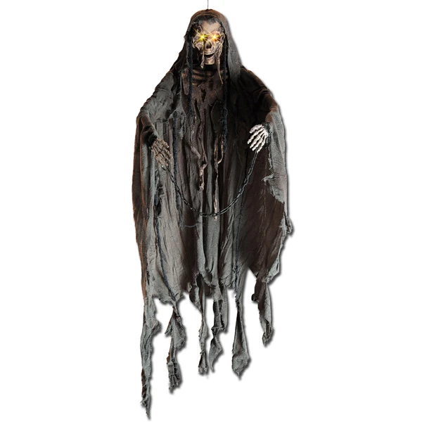 Suspension squelette ou zombie enchainé Squelette en plastique , polystyrène et tissu de 160 cm de haut avec système lumineux dans les yeux piles non fournies